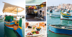 Geen culinaire roadtrip door Malta is compleet zonder een bezoek aan Marsaxlokk, het kleurrijke vissersdorp in het zuiden. Het staat bekend om zijn traditionele luzzu’s, felgekleurde vissersboten met het Oog van Osiris als bescherming tegen het kwaad. Op zondag komt de haven tot leven met de beroemde vismarkt, waar verse lampuki (goudmakreel, vooral in de herfst), zwaardvis, octopus en schaaldieren rechtstreeks van de boten komen. Marsaxlokk is de plek waar de zee écht op je bord belandt.